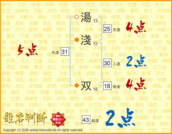 生活面を象徴する運勢です。外部から受ける影響力を表し、結婚運、家庭運や職場、環境への順応性を表します。総運から人運を引いた画数。姓や名が1文字の場合を除く。