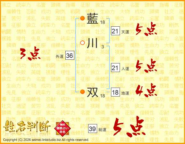 あなたの人生を表す1番重要な運勢です。生涯を通じて影響する総合運となり、主に50歳以降の晩年期に影響を及ぼします。苗字と名前の合計画数。