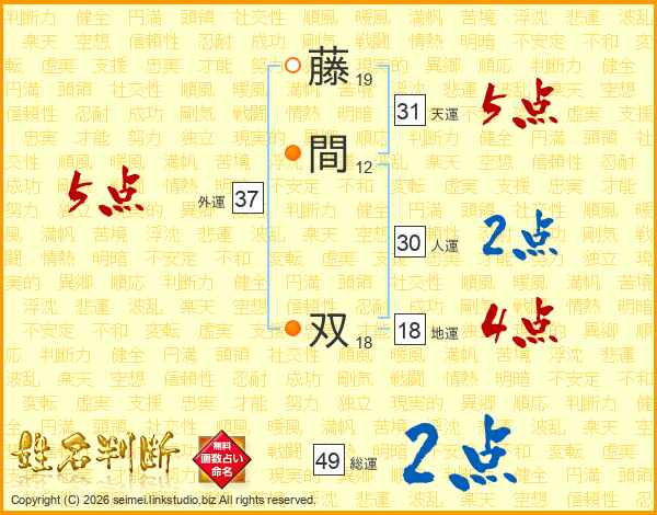 あなたの人生を表す1番重要な運勢です。生涯を通じて影響する総合運となり、主に50歳以降の晩年期に影響を及ぼします。苗字と名前の合計画数。