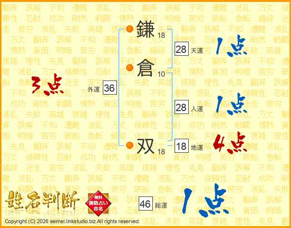 生活面を象徴する運勢です。外部から受ける影響力を表し、結婚運、家庭運や職場、環境への順応性を表します。総運から人運を引いた画数。姓や名が1文字の場合を除く。