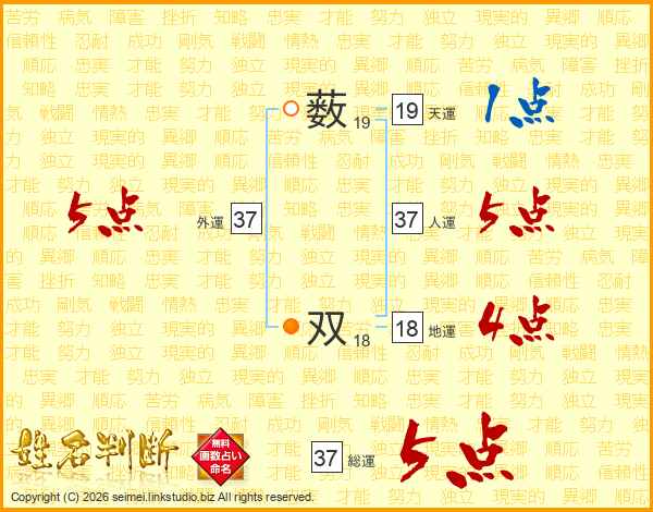 生活面を象徴する運勢です。外部から受ける影響力を表し、結婚運、家庭運や職場、環境への順応性を表します。総運から人運を引いた画数。姓や名が1文字の場合を除く。
