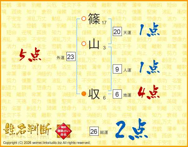 生活面を象徴する運勢です。外部から受ける影響力を表し、結婚運、家庭運や職場、環境への順応性を表します。総運から人運を引いた画数。姓や名が1文字の場合を除く。