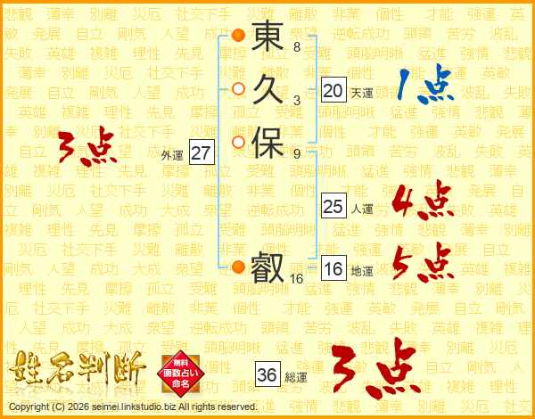 生活面を象徴する運勢です。外部から受ける影響力を表し、結婚運、家庭運や職場、環境への順応性を表します。総運から人運を引いた画数。姓や名が1文字の場合を除く。