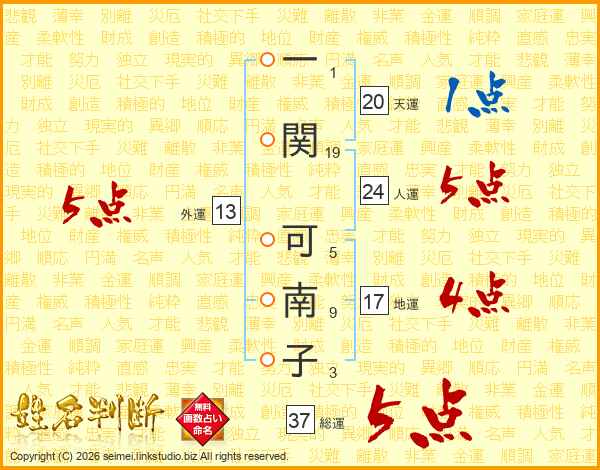 一(1画)関(19画) 可(5画)南(9画)子(3画)