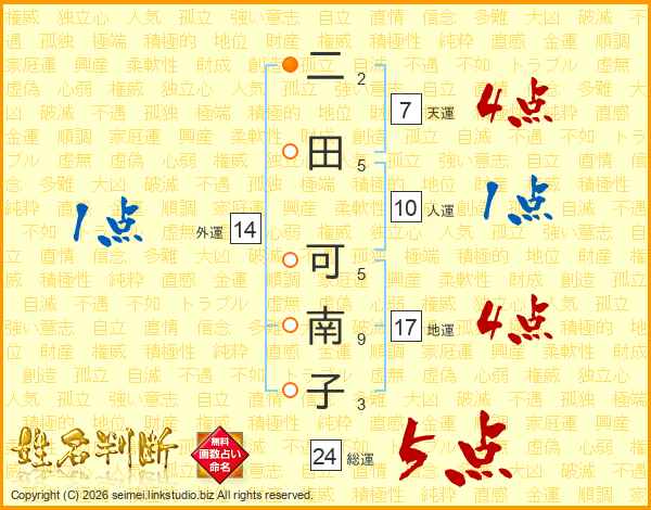 生活面を象徴する運勢です。外部から受ける影響力を表し、結婚運、家庭運や職場、環境への順応性を表します。総運から人運を引いた画数。姓や名が1文字の場合を除く。