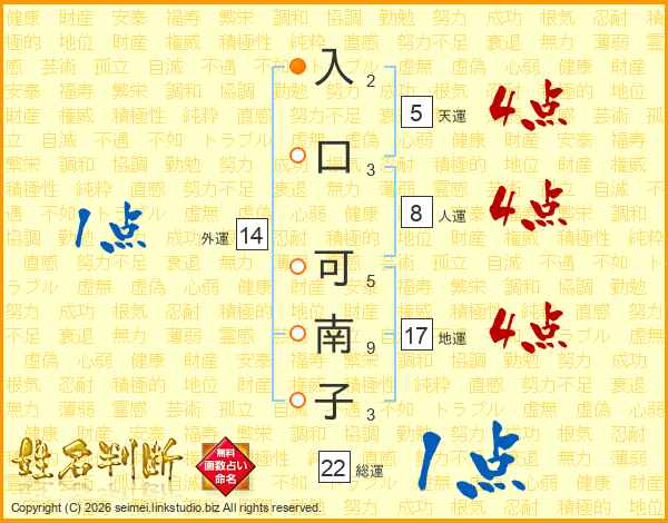 生活面を象徴する運勢です。外部から受ける影響力を表し、結婚運、家庭運や職場、環境への順応性を表します。総運から人運を引いた画数。姓や名が1文字の場合を除く。