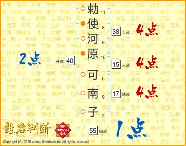 勅(11画)使(8画)河(9画)原(10画) 可(5画)南(9画)子(3画)