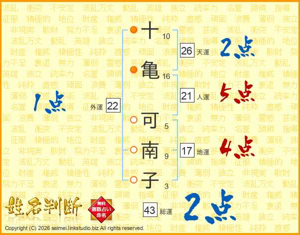 十(10画)亀(16画) 可(5画)南(9画)子(3画)