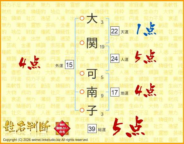 大(3画)関(19画) 可(5画)南(9画)子(3画)