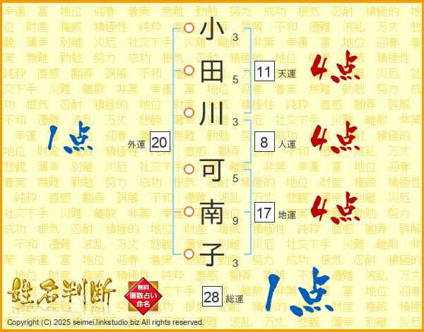 小(3画)田(5画)川(3画) 可(5画)南(9画)子(3画)