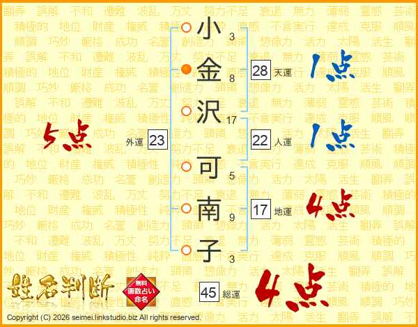 小(3画)金(8画)沢(17画) 可(5画)南(9画)子(3画)