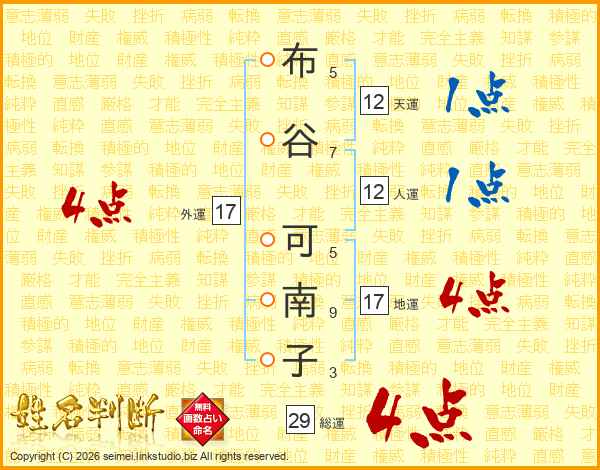 布(5画)谷(7画) 可(5画)南(9画)子(3画)