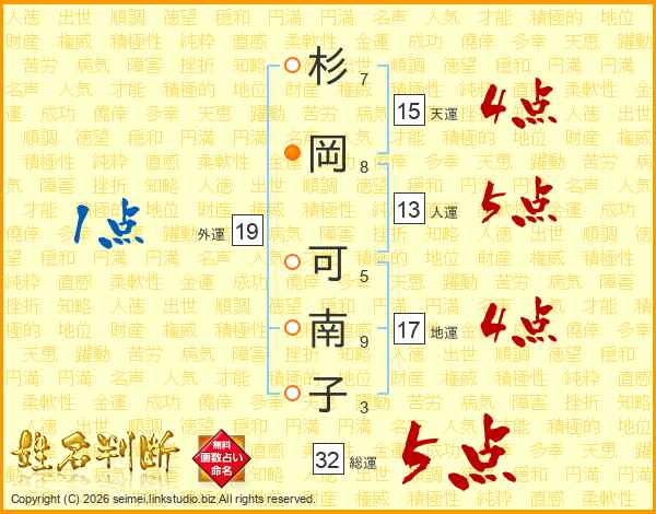 杉(7画)岡(8画) 可(5画)南(9画)子(3画)