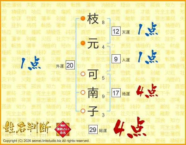枝(8画)元(4画) 可(5画)南(9画)子(3画)