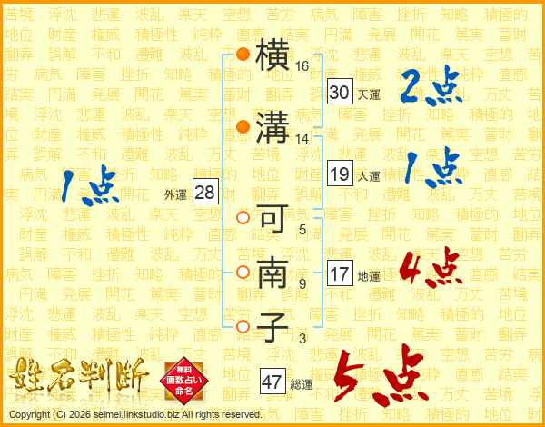 横(16画)溝(14画) 可(5画)南(9画)子(3画)