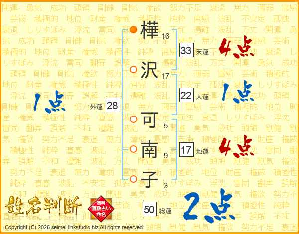 樺(16画)沢(17画) 可(5画)南(9画)子(3画)