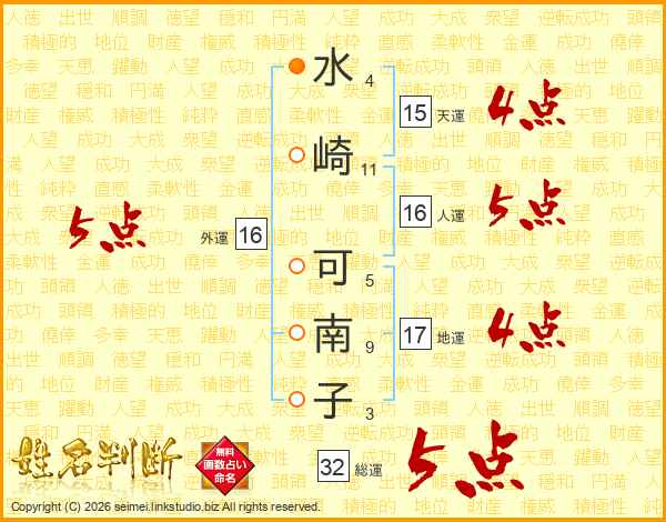 水(4画)崎(11画) 可(5画)南(9画)子(3画)