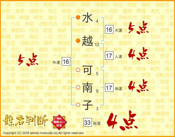 水(4画)越(12画) 可(5画)南(9画)子(3画)