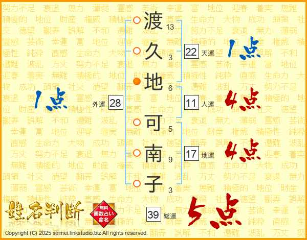 渡(13画)久(3画)地(6画) 可(5画)南(9画)子(3画)