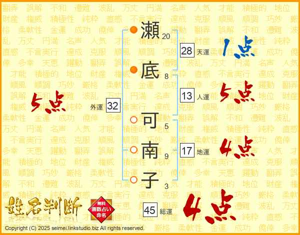 瀬底可南子さんの総運は45画の4点!