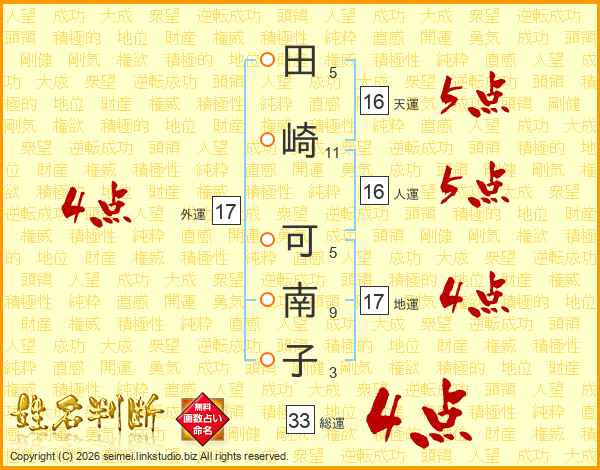 田(5画)崎(11画) 可(5画)南(9画)子(3画)