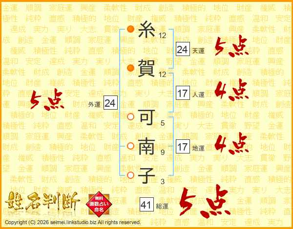糸(12画)賀(12画) 可(5画)南(9画)子(3画)