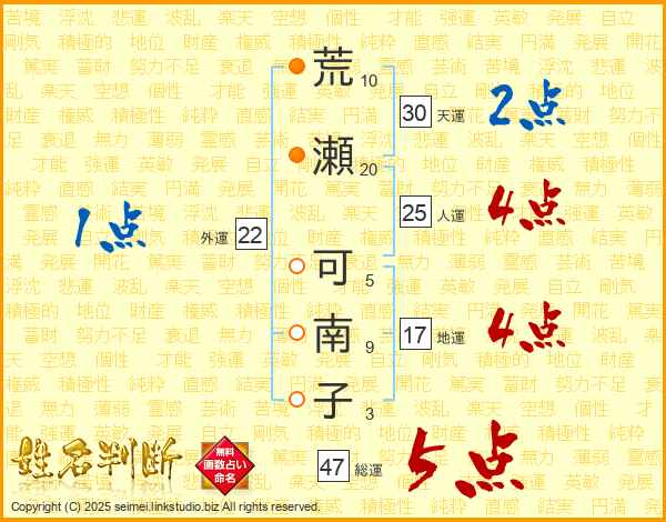 荒(10画)瀬(20画) 可(5画)南(9画)子(3画)