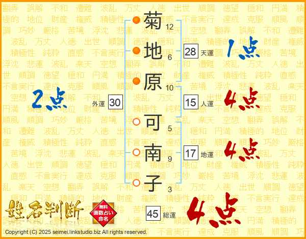 菊(12画)地(6画)原(10画) 可(5画)南(9画)子(3画)