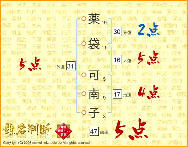 生活面を象徴する運勢です。外部から受ける影響力を表し、結婚運、家庭運や職場、環境への順応性を表します。総運から人運を引いた画数。姓や名が1文字の場合を除く。