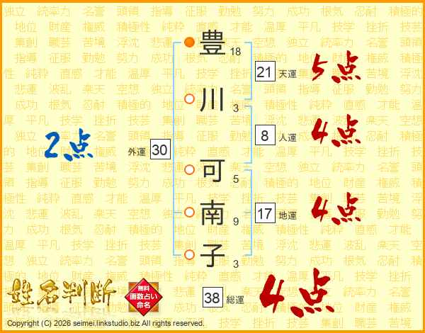 豊(18画)川(3画) 可(5画)南(9画)子(3画)