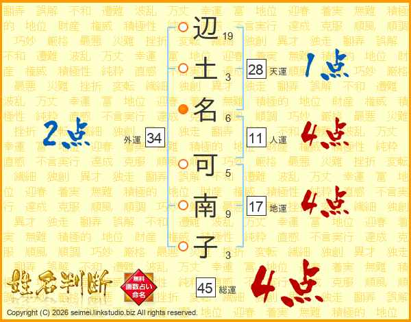 辺(19画)土(3画)名(6画) 可(5画)南(9画)子(3画)