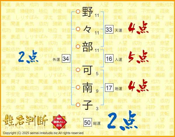 野(11画)々(11画)部(11画) 可(5画)南(9画)子(3画)