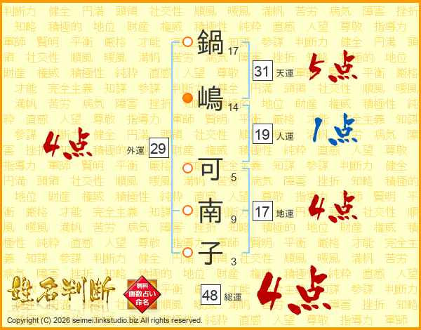 鍋(17画)嶋(14画) 可(5画)南(9画)子(3画)