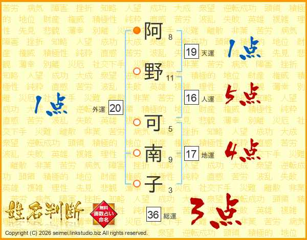 阿(8画)野(11画) 可(5画)南(9画)子(3画)