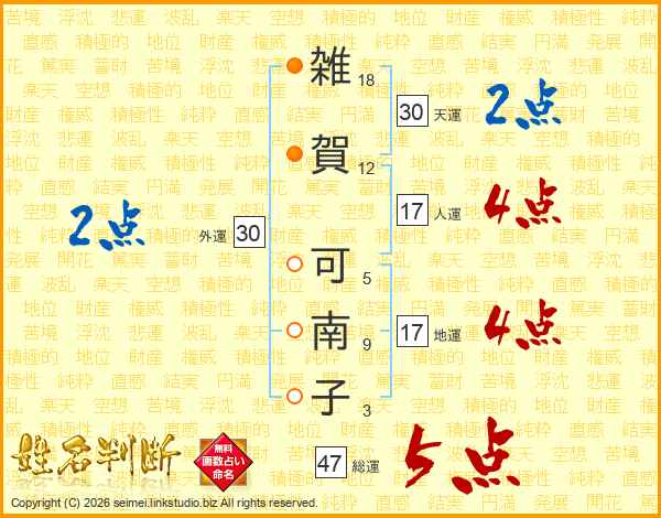 雑(18画)賀(12画) 可(5画)南(9画)子(3画)