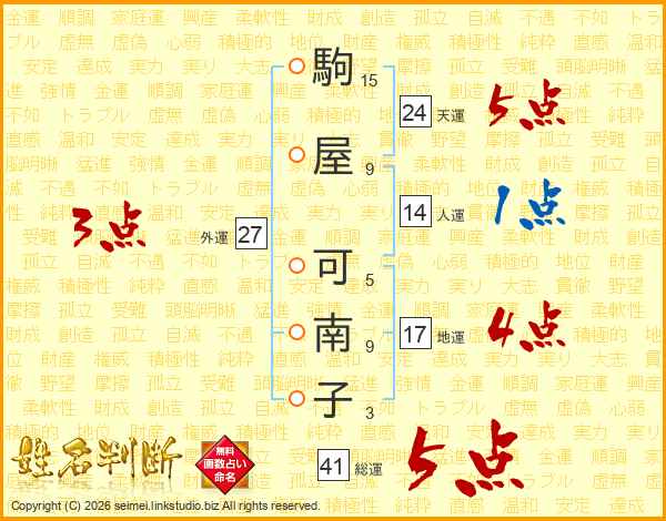 駒(15画)屋(9画) 可(5画)南(9画)子(3画)