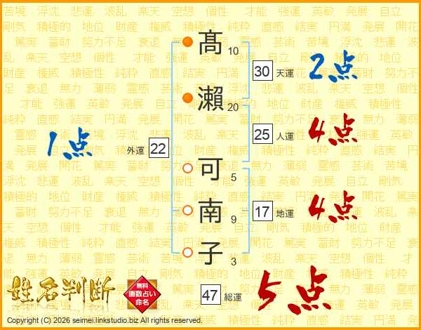 髙(10画)瀨(20画) 可(5画)南(9画)子(3画)