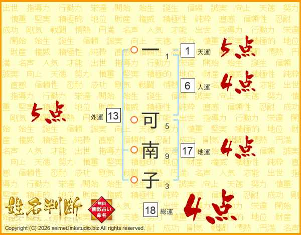 生活面を象徴する運勢です。外部から受ける影響力を表し、結婚運、家庭運や職場、環境への順応性を表します。総運から人運を引いた画数。姓や名が1文字の場合を除く。