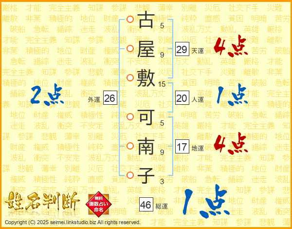 古(5画)屋(9画)敷(15画) 可(5画)南(9画)子(3画)