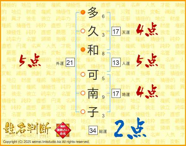 生活面を象徴する運勢です。外部から受ける影響力を表し、結婚運、家庭運や職場、環境への順応性を表します。総運から人運を引いた画数。姓や名が1文字の場合を除く。