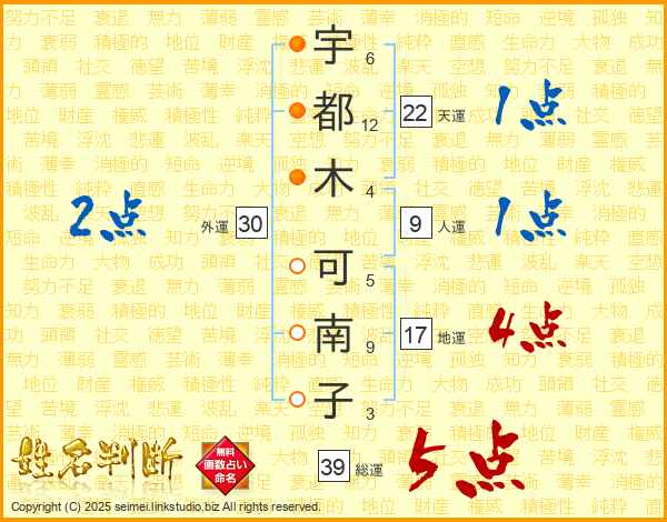 宇(6画)都(12画)木(4画) 可(5画)南(9画)子(3画)