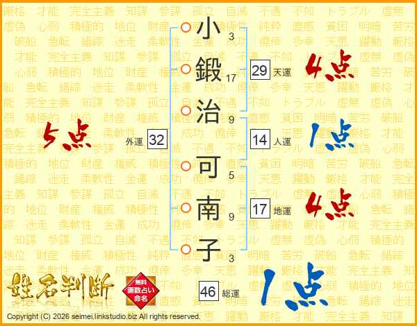 小(3画)鍛(17画)治(9画) 可(5画)南(9画)子(3画)
