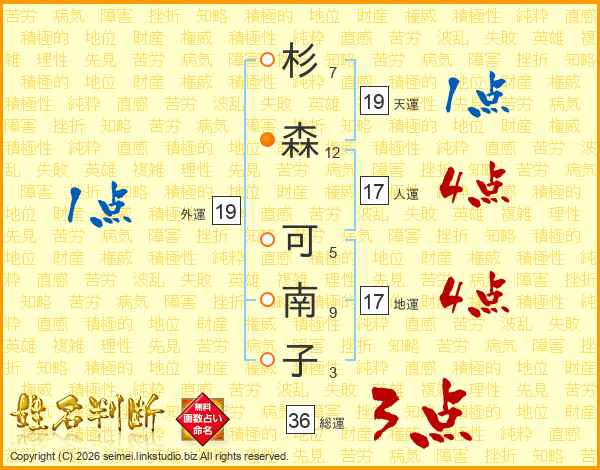 杉(7画)森(12画) 可(5画)南(9画)子(3画)