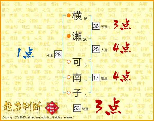 横(16画)瀬(20画) 可(5画)南(9画)子(3画)