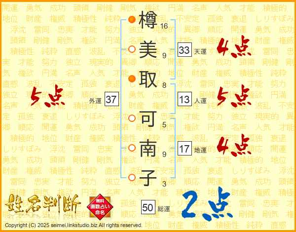 樽(16画)美(9画)取(8画) 可(5画)南(9画)子(3画)