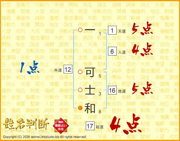 生活面を象徴する運勢です。外部から受ける影響力を表し、結婚運、家庭運や職場、環境への順応性を表します。総運から人運を引いた画数。姓や名が1文字の場合を除く。