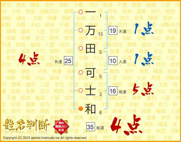 生活面を象徴する運勢です。外部から受ける影響力を表し、結婚運、家庭運や職場、環境への順応性を表します。総運から人運を引いた画数。姓や名が1文字の場合を除く。