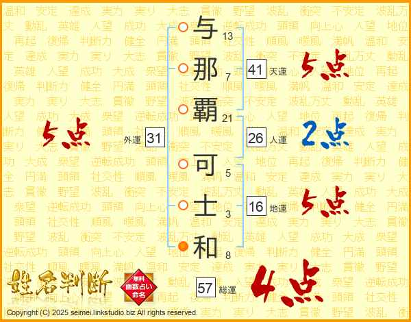 与那覇可士和さんの天運は41画の5点!