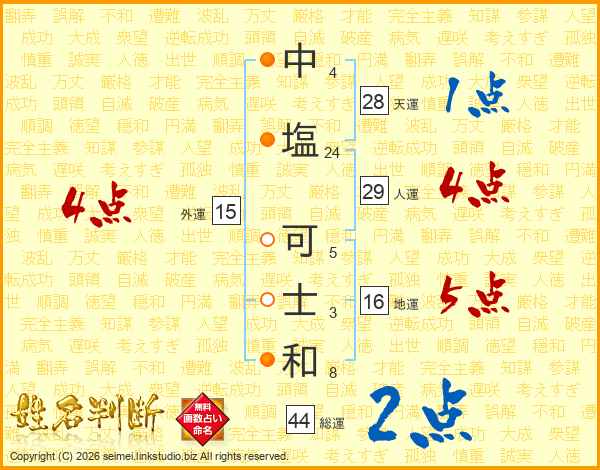 中(4画)塩(24画) 可(5画)士(3画)和(8画)