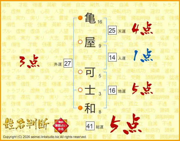 亀(16画)屋(9画) 可(5画)士(3画)和(8画)